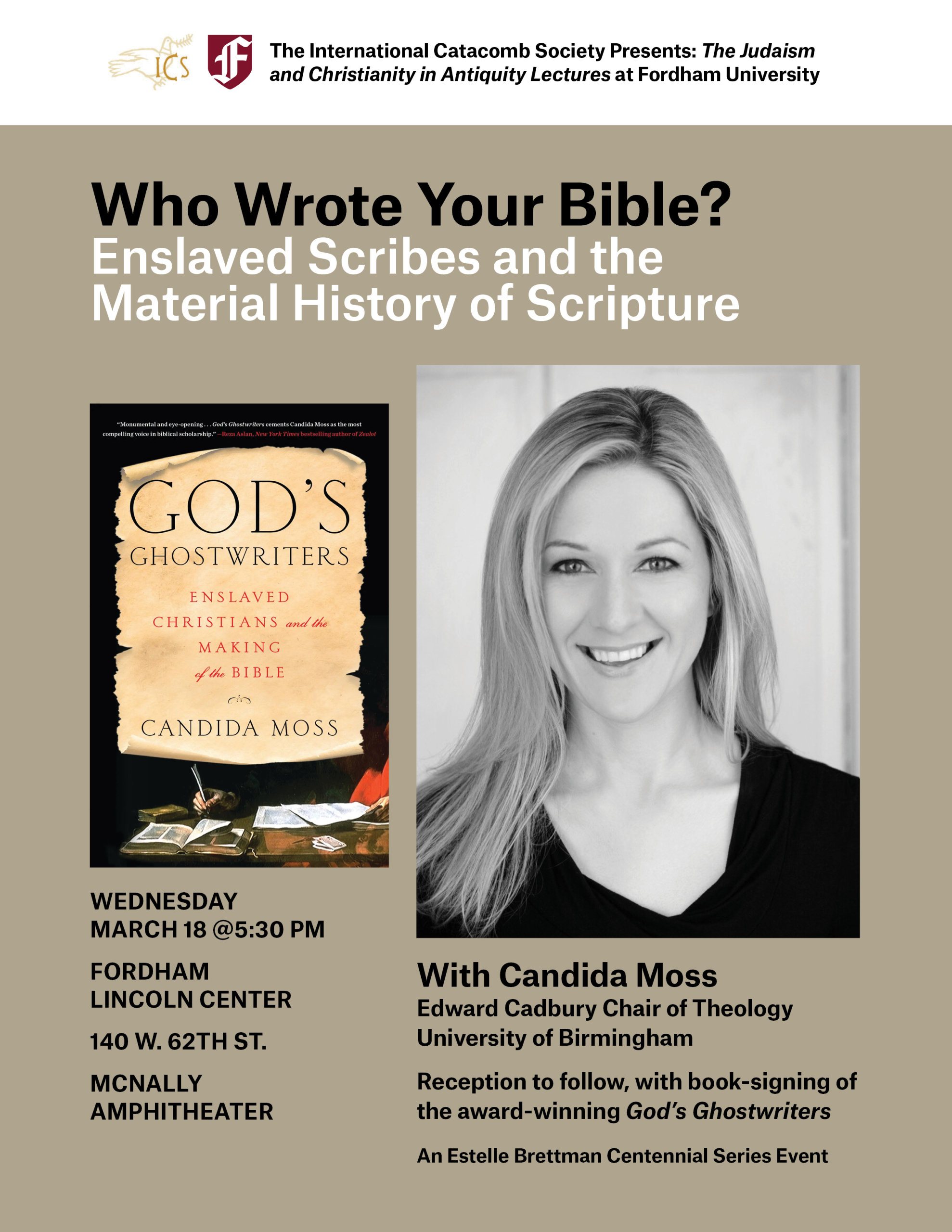 Join us for a lecture with acclaimed scholar and author Candida Moss, followed by reception and book-signing. Livestream available here: https://youtube.com/live/ued9wvZo8DU?feature=share.