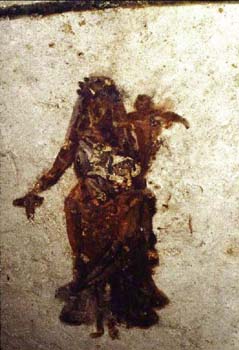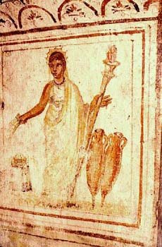 | 109. In another embodiment of nature's abundance, Demeter (or Ceres, the Roman goddess of the fruitful earth) is depicted as a fashionable Roman matron. With her right hand, she sprinkles grain from a sheaf; in her left, she bears aloft the flaming torch of life. Wall painting. Cubiculum O, catacomb of Via Latina. |