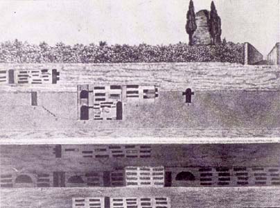 Five levels of the Christian catacomb of S. Callisto are shown in cross-section. After a design by De Rossi in Roma sotterranea cristiana descritta ed illustrata, II (Roma, 1864-1877), Tav. 51 and 52.