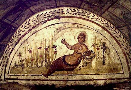 110. Reclining amidst a lush field of roses and wheat, a voluptuous pagan earth goddess clutches to her bosom a serpent, symbol of earth's fecundity. The scene has been associated with the myth of the fertility goddess Persephone, but popularly evokes the sad fate of Egypt's queen. Lunette painting. Cubiculum E, catacomb of Via Latina.