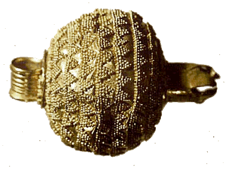 115. Representatives of pomegranates have been found in funerary contexts as early as the third millennium B.C.E. in the royal burials of Ur. This gold granulated Mycenaean pomegranate pendant of the fourteenth century B.C.E. was discovered in a burial in Cypress. London, British Museum. |