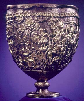 119. In a similar setting, Jesus assumes the role of philosopher-teacher, enthroned apparently among the apostles, with whom he is engaged in discourse under the shade of their vine. Silver gilt eucharistic cup of the first half of the sixth century. New York, Metropolitan Museum of Art. |