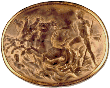 123. His chariot drawn by hippocamps, Augustus as Neptune calms the stormy seas with his trident, as a triton rises from the sea before him and a dolphin follows. The victory of Augustus at the battle of Actium in 31 B.C.E. may have been allegorized on this milky sard intaglio from Tunis. Boston, Museum of Fine Arts.