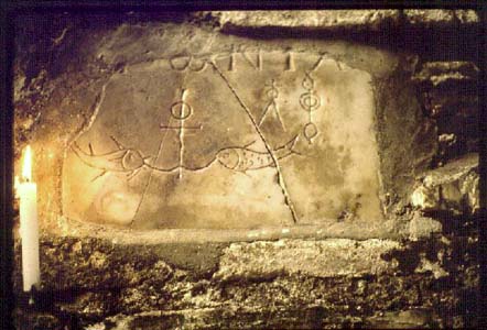 A fragmentary epitaph from the catacomb of Domitilla shows fish bearing in their mouths a cross-like anchor, reminiscent of the Egyptian ankh or crux ansata.