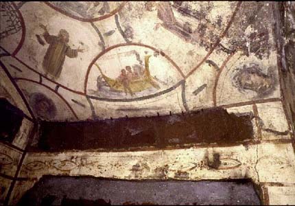 Jonah and the "Whale" 129. Jonah is tossed from the canopied bark to the impatient monster of the sea. Vault painting. Catacomb of SS. Marcellino e Pietro.