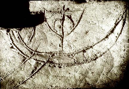 Graffito of a ship with oars from the Villa Torlonia catacombs.