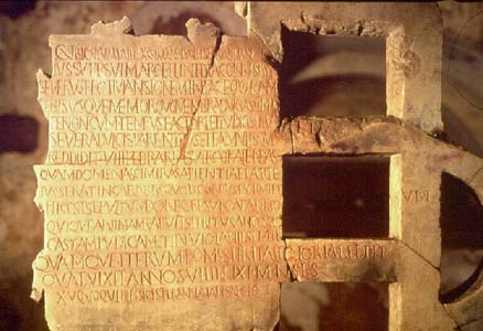 139. The epitaph in Latin reads; "By the order of his Pope Marcellino, this Deacon Severus, grateful has constructed for himself and his (family) a tranquil sojourn in peace, in which to keep, for a long time the beloved limbs in the slumber of peace for the Creator and Judge. The maiden Severa, a delight to parents and to family, surrendered her spirit on the 8th day of the Kalends [January 24]: upon her the Lord bestowed from birth extraordinary wisdom and skill. Her body, resting in peace, is buried here until it rises again and the Lord who seized from her hallowed life's breath her pure, chaste and at all times inviolable soul, restores again her spiritual glory. She lived nine years, eleven months, and fifteen days; thus she departed from this life." Catacomb of S. Callisto. |