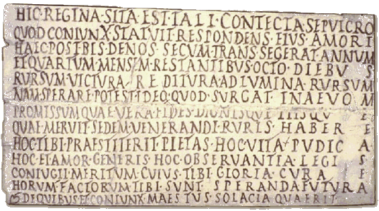140. This Latin inscription in poetic meter comes from the Jewish catacomb of Monteverde: "Here lies Regina covered by such a tomb which her husband set up as fitting to his love. After twice ten years she spent with him one year, four months and eight days more. She will live again, return to the light again, for she can hope that she will rise to the eternal life promised, as is pledged to the worthy and the pious, in that she has deserved to possess an abode in the hallowed land. This your piety has assured you, this your chaste life, this your love for your family, this your observance of the Law, your devotion to your wedlock, the glory of which was dear to you. For all these deeds your hope of the future is secure. In this your sorrowing husband seeks his comfort. |