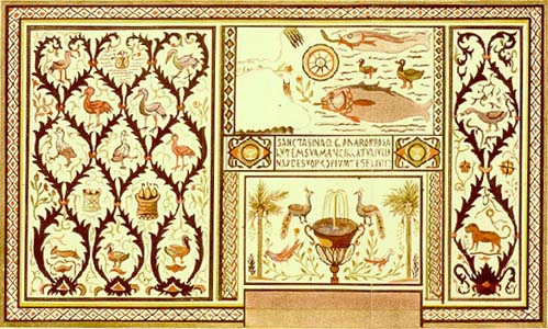 146. A microcosmic view of the creatures and vegetal life of paradise is represented in this mosaic floor. Sixth-century Synagogue at Hammam Lif, Tunisia. Colored drawing from the Révue archéologique, Ser. III, Vol. III (1884), plates VII/VIII.
