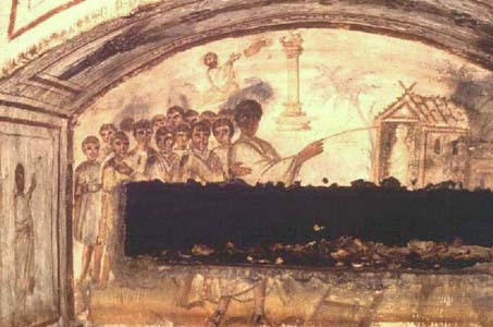 The Law and Deliverance 159. Atop Mt. Sinai veiled in clouds, Moses receives the Law from the hand of God; below, Jesus raises Lazarus from the dead. Lunette painting. Cubiculum O, catacomb of Via Latina.