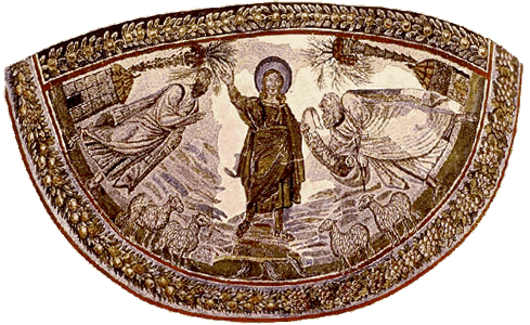 160. In majestic imperial stance near his flock, a nimbed Jesus presents Peter with the scroll of the Law, representing the Church, as Paul looks on. Restored mosaic, ambulatory of Sta. Costanza, about the first half of the fourth century.