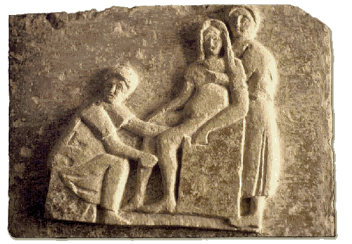 A midwife assists in the delivery of a child. Terra-cotta relief from a tomb in Isola Sacra, the ancient cemetery of the Imperial port of Rome. Ostia, Museo Ostiense.