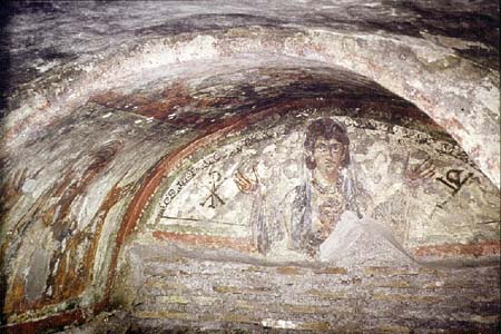 185. A pair of Constantinian monograms, later known as Christograms, flank a mother with a child. The scene has been variously interpreted as the deceased with her child or as the Madonna and Child. Lunette painting in an early-fourth-century chapel. Cimitero Maggiore or Maius.