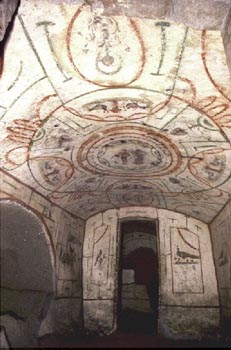 22. As in the previous fresco, the central motif (here the crowning of a youth), painted on the vault of cubiculum I in the Jewish catacomb of Vigna Randanini, is surrounded by symbolic flora and fauna. This cemetery lies close to pagan and Christian burial grounds, as well as to the "Villa Piccola."