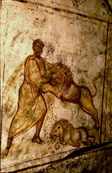The Old Testament hero Samson rend a lion. Life is virtually born from the jaws of death as bees busily make honey in the dead lion's mouth. Wall painting. Vano (room) L, the catacomb of Via Latina.