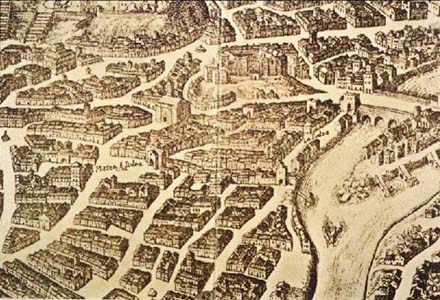 31. A section of the line drawing from Giambattista Falda's La Pianta di Roma del 1676 (Città del Vaticano) shows the quarters near the Tiber that Bosio frequented. The largest communities of Jew had moved from the right bank of the Tiber to the left bank, mainly in the region around the Piazza Giudea, later to become the Ghetto; others were located near the Porta Nomentana.