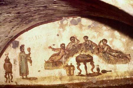 Revelers hold forth at a lively agape under a rose bower. Roses symbolized immortality and rebirth for the ancient Greeks and later the Romans. Painted lunette. Catacomb of SS. Marcellino e Pietro.