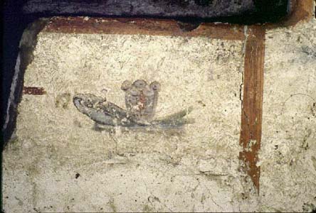 75. For Christians, the Greek word for fish, ichthus, is an acronym for Jesus Christ, Son of God, Savior. Here the fish is accompanied by the symbols of Christian Holy Communion. Wall painting. Catacomb of S. Callisto. |