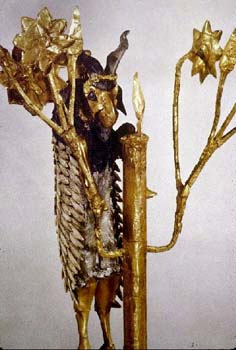 77. This gold and silver caprid prefigures the biblical description of Abraham's sacrificial ram. From the graves of Ur in Mesopotamia, the ram here is a metaphor for virility and renewal as embodied in the Near Eastern "dying and rising" god of vegetation, Tammuz, associated with the cycle of the seasons. Probably a stand for an offering bowl. London, British Museum. |