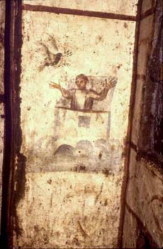 Noah as an orant emerges from the ark-sarcophagus to welcome the dove bearing an olive spray. Wall painting. Catacomb of SS. Marcellino e Pietro.