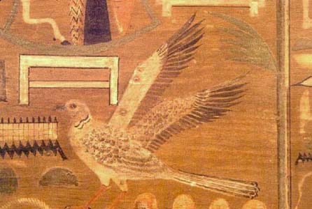 Detail from an offering scene on the outer coffin of Djehuty-Nekht, El Bersheh, Egypt. Painted cedar, Dynasty XII. In Egyptian thought, the soul often took on the form of a bird with a human head. Boston, Museum of Fine Arts.