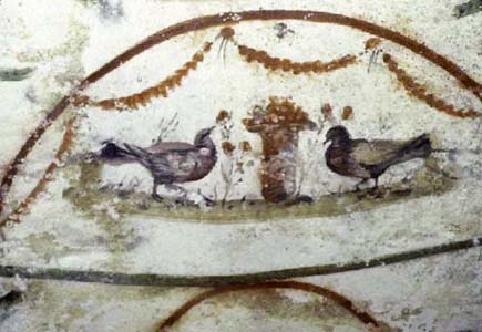 Doves Enjoying Celestial Roses 93. On a vault painting from cubiculum I in the catacomb of Vigna Randanini, the curtains of Paradise are opened to reveal two symbols of hope, the dove and the rose.