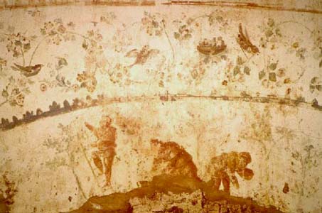 Winter is depicted in a vault painting from the catacomb of Pretestato.